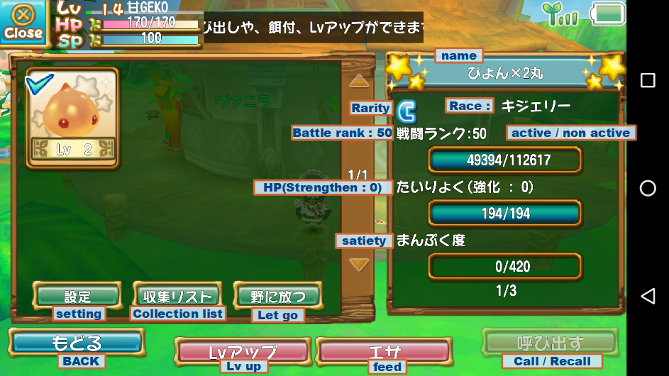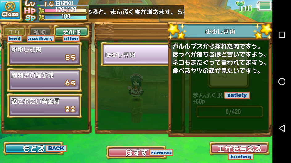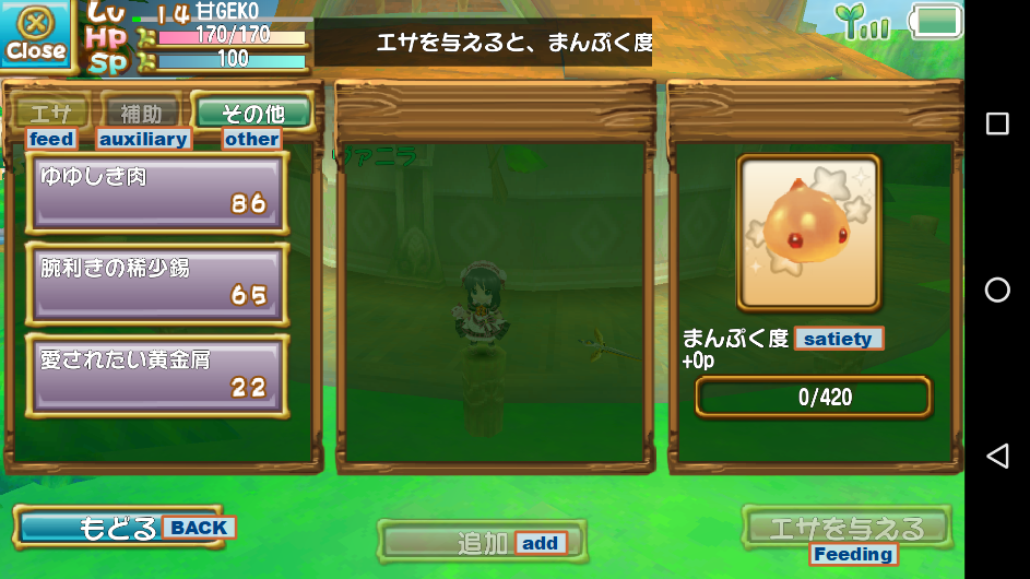In order to restore the satiety, it is necessary to feed the material items that are normally used in production. It can be given from “プチフレ(Petit Friends)” → “エサ(feed)” → “その他(other)”.